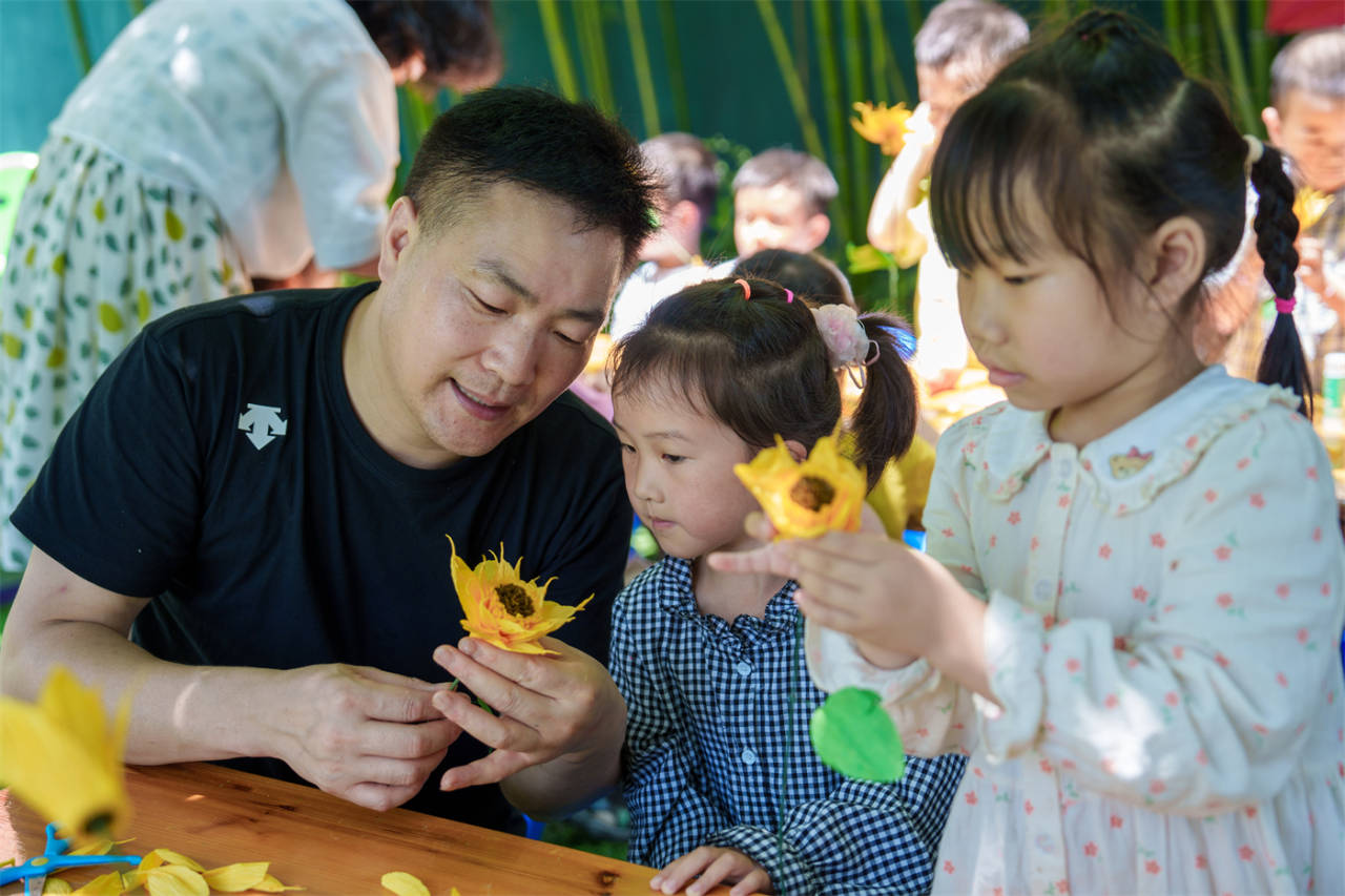 本周日,是父親節。6月13日上午,衢州市柯城區黃家街道博雅幼兒園在父親節來臨之際開展了“‘匠心圓夢’剪紙非遺進村社”公益課堂活動。省級非遺項目柯城剪紙傳承人鄭志輝教孩子們制作送給爸爸的禮物——向日葵,在豐富孩子們課堂文化的同時,也傳承傳統文化。