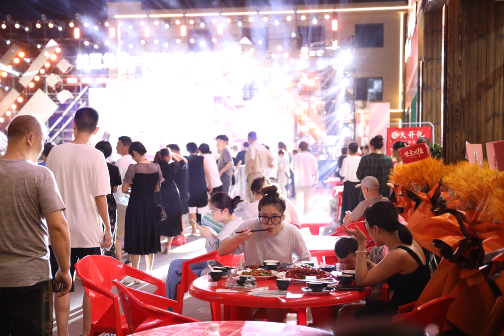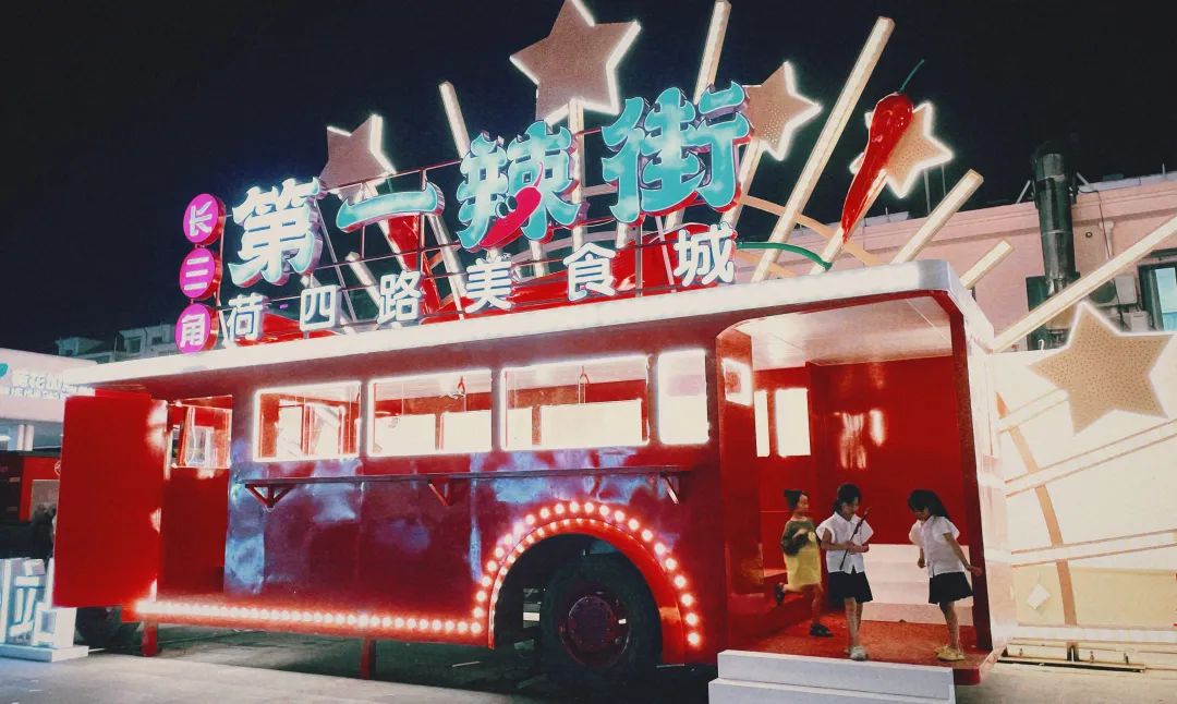 夜幕降臨,荷四路兩側的行道樹上,紅彤彤的辣椒燈串起了濃濃的煙火氣息,美食城獨具特色的門頭和布景成了盛宴的前奏。